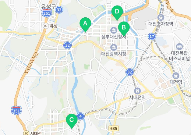 대전시 서구청에서 운영하는 물놀이장은 A는 은평공원, B는 샘머리공원어린이놀이터, C는 가수원근린공원, D는 대전엑스포시민광장에서 물놀이를 진행합니다. A, B, C는 운영일자가 동일하며 대전엑스포만 일정이 조금 다릅니다. 상황에 따라 주차시설 이외에도 정보 알아보시길 추천드립니다.