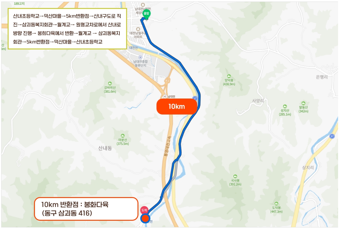 산내초등학교 - 덕산마을 - 5km 반환점 - 산내구도로 직진 - 삼괴동복지회관 - 월계교 - 원형교차로에서 산내로 방향 진행 - 봉희다육에서 반환 - 월계교 - 삼괴동복지회관 - 5km 반환점 - 덕산망르 - 산내초등학교
